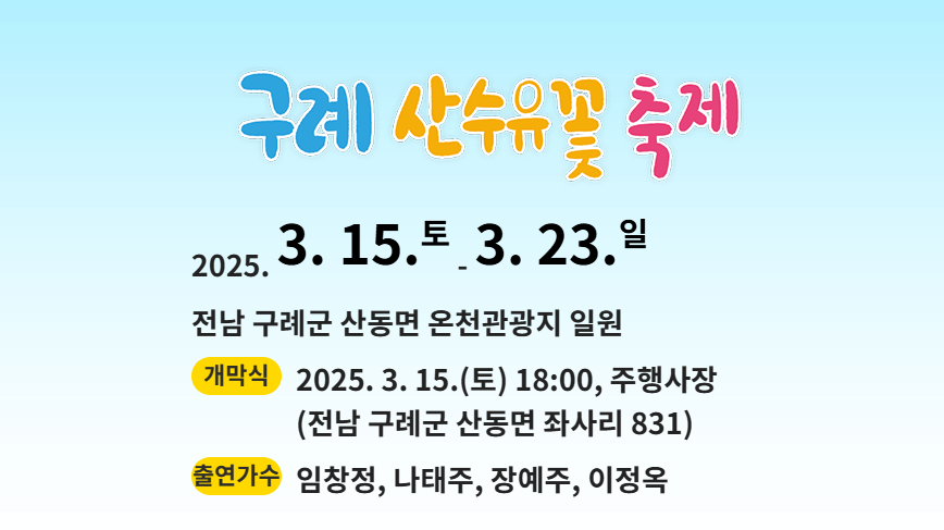 - 장소: 전라남도 구례군 산동면 구례 산수유꽃축제장