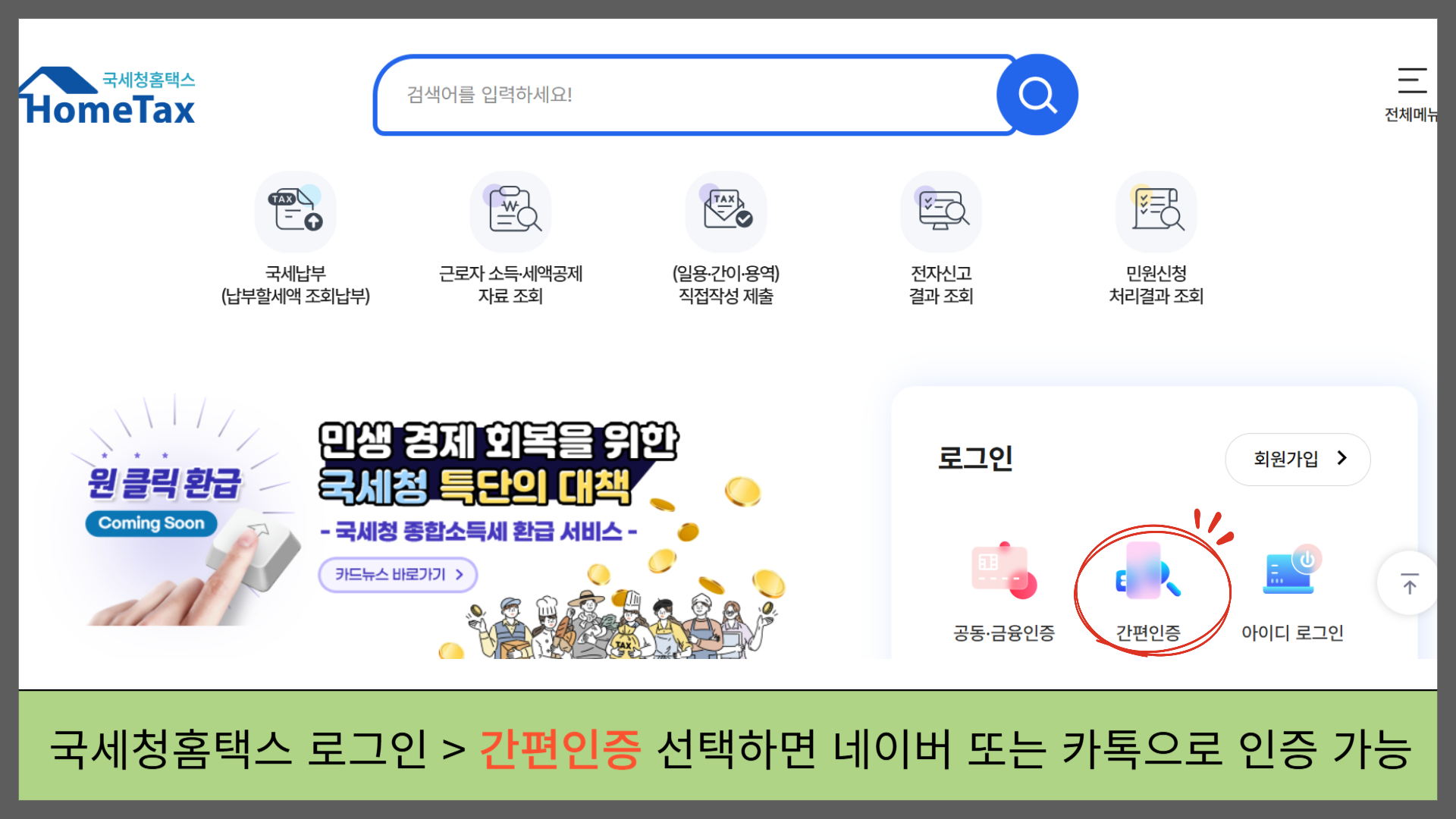 2️⃣ 로그인: 공동인증서, 금융인증서, 네이버·카카오 간편인증 중 선택