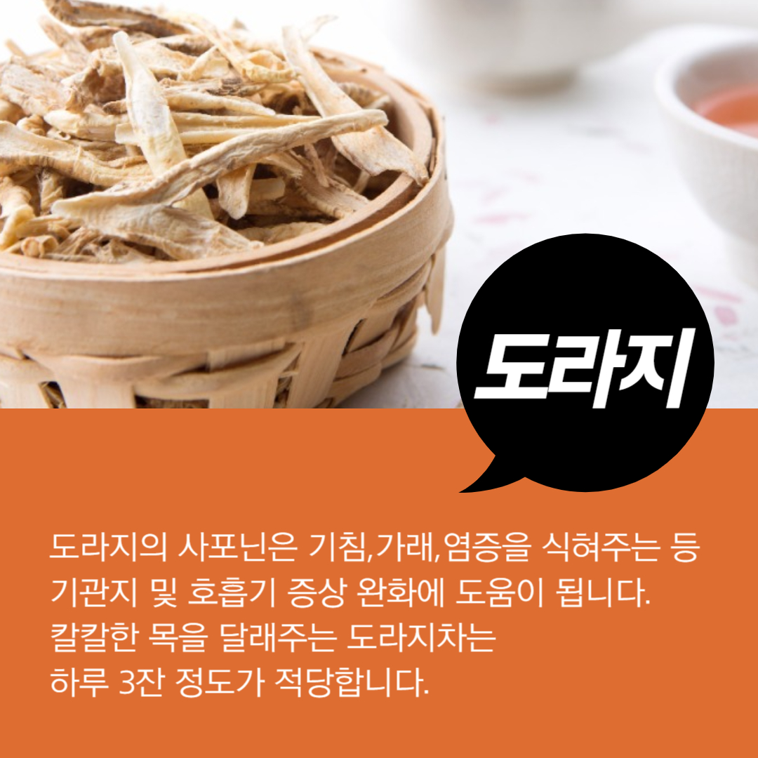 - 도라지차나 도라지청으로 따뜻하게 마시는 것이 좋음.