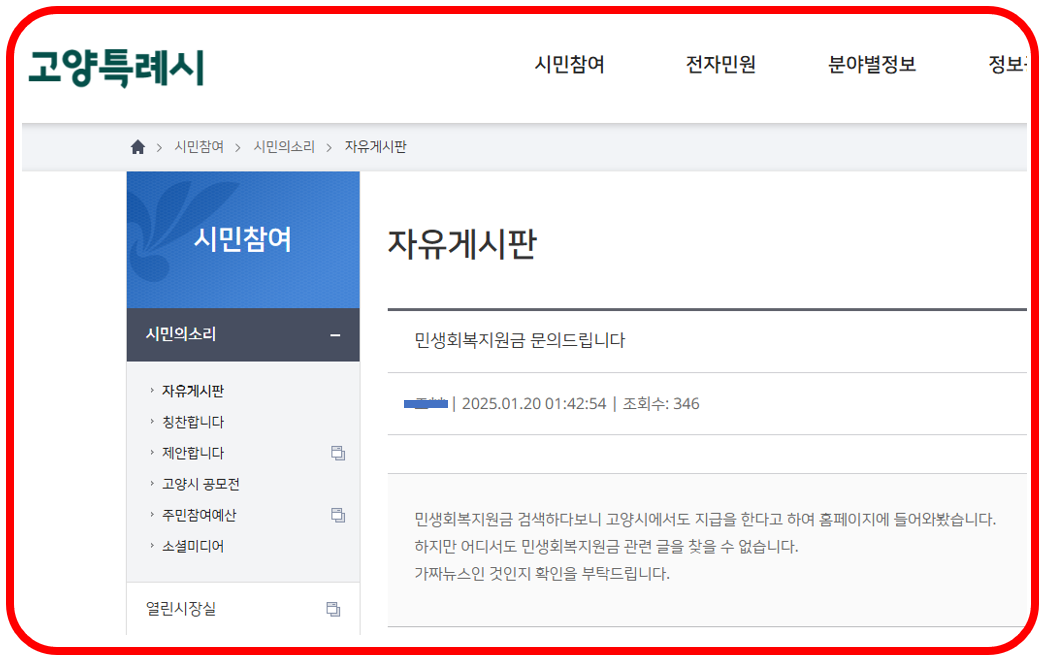 고양시는 현재 민생지원금 지급 계획이 없음을 공식 발표했습니다. 일부 블로거들이 확인도 하지 않은 채 가짜 뉴스를 양산하고 있습니다. 이로인해 시민들이 고양시 홈페이지에 문의를 할 정도로 가짜 뉴스가 확산되고 있는 모양새입니다. 블로그와 SNS를 통해 민생지원금이 지급된다는 잘못된 정보가 퍼지고 있으니, 반드시 고양시청이나 공신력 있는 뉴스를 통해 정확한 정보를 확인하시기 바랍니다.