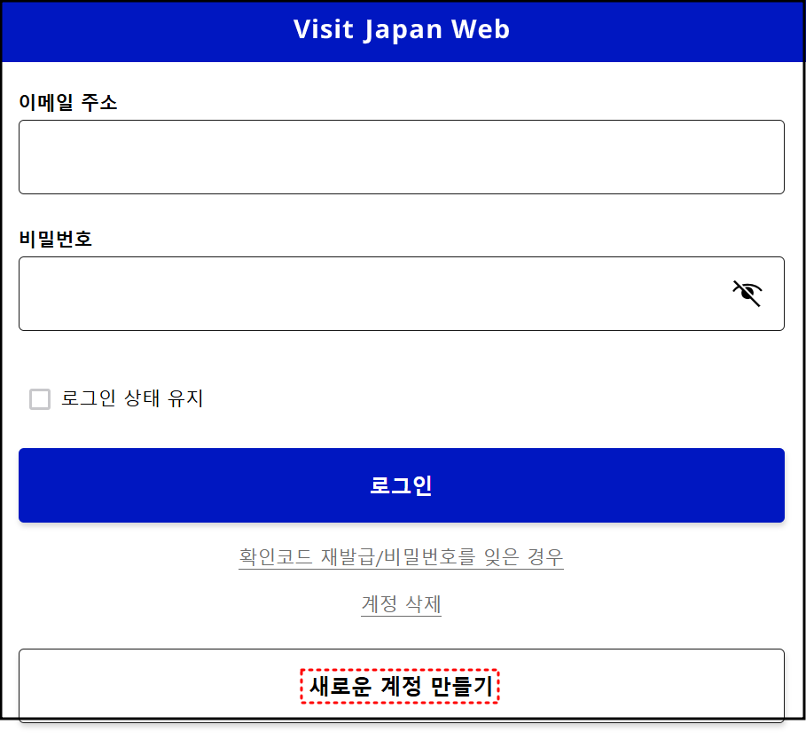 - Visit Japan Web 로그인 화면 하단의 ‘새로운 계정 만들기’ 클릭