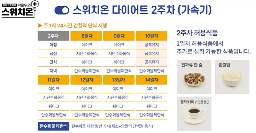 | 1주차 (1~3일차) | 탄수화물 제한 & 지방 연소 모드 전환 | 단백질 쉐이크 4회, 채소, 두부 |