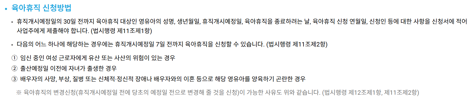 - 단, 임신 중 유산 위험, 조기 출산 등 예외적인 경우 7일 전까지 신청 가능