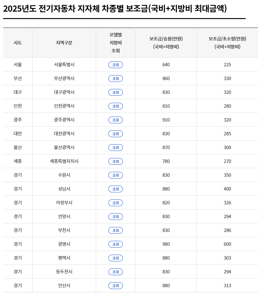 [ 2025년 지자체별 전기차 - 지자체 보조금 ] (단위 : 만원, 승용기준)