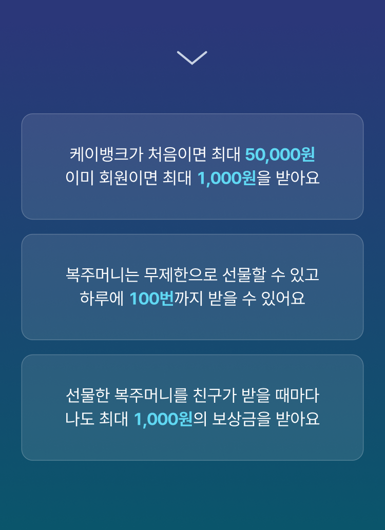 K뱅크를 처음 가입하는 신규 회원은 복주머니 이벤트를 통해 최대 50,000원의 혜택을 받을 수 있습니다. 새해와 함께 K뱅크의 특별한 선물을 받아보세요.